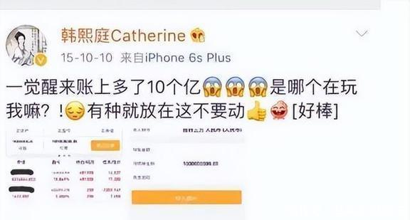 有一回拍卖会上,韩熙庭也就是随口一说,说挺喜欢那个东西,想收着。结果王永红眼睛都不眨一下,花了1.24亿给她买了个清朝的双龙尊瓷器。这种小说里才会写的“豪掷千金博美人一笑”的戏码,居然在现实里上演了。韩熙庭很快也就陷进去了,跟王永红好得蜜里调油,俩人出门啥的也不躲着记者。韩熙庭还发过一条微博,说“一觉醒来账上多了10个亿”。